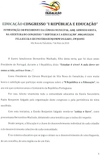 Apresento o discurso do Presidente do Município de Vila Nova de Famalicão Arq.º Armindo Costa no Congresso a 1.ª República e a Educação, organizado pela Escola Secundária Padre Benjamin Salgado, de Joane, concelho de Famalicão.